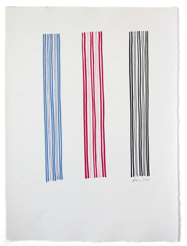 Because Davis had learned the stain technique from Louis and Noland, some observers mistakenly assumed that he derived his subject matter from the two men as well. In fact, when Davis finally settled on the stripe as the primary vehicle for his art in 1958, he anticipated Louis’ 1961 pillar paintings by three years and Noland’s horizontal-band series by eight years.