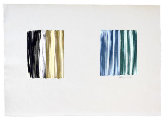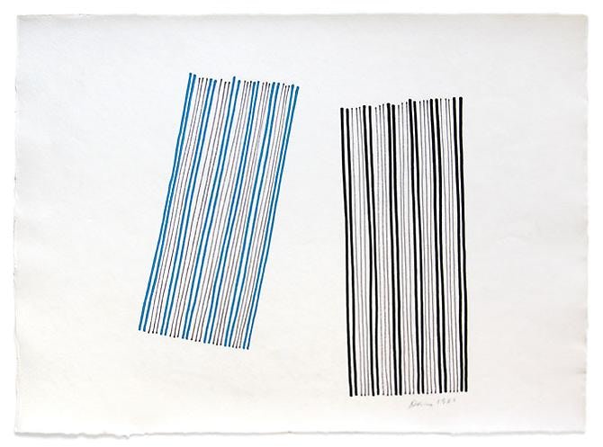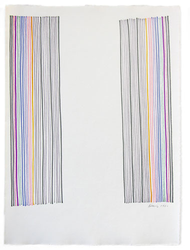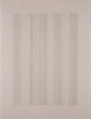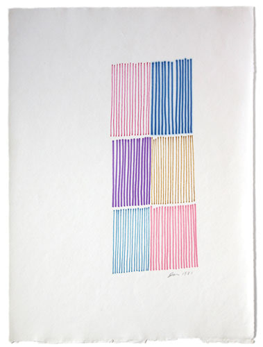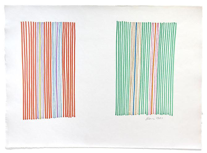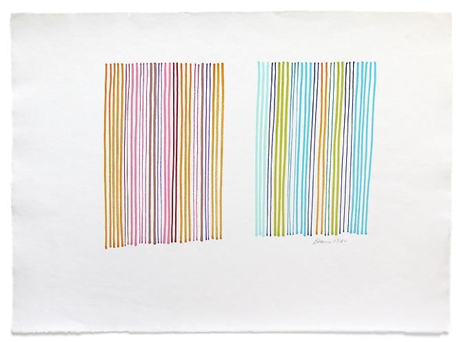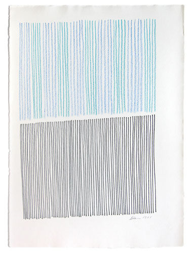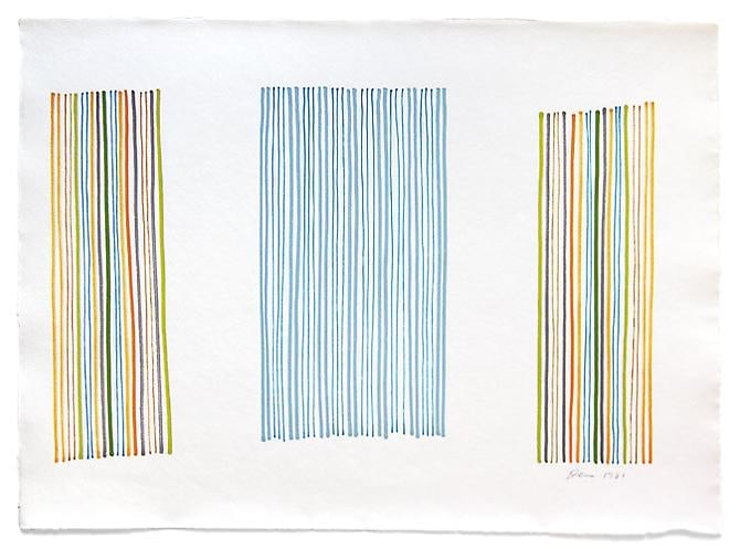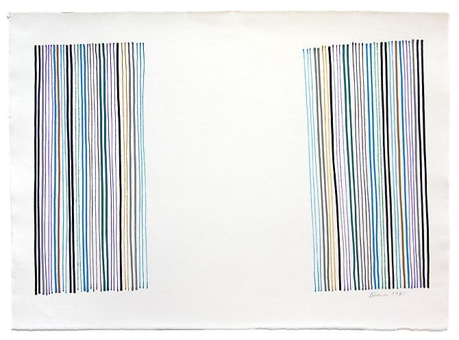 Almost from the beginning, Davis, a fiercely independent man, began to distinguish his work from that of his fellow Washington artists in other ways. The lucidity of his first fully-realized stripe paintings, such as Peach Glow, yielded to stripe paintings of remarkable complexity. Having tried to “avoid any complex adventures for the eye,”3 he began to offer the viewer a “feast for the eyes.”4 Instead of developing the stripe as a format for color, he began to use color “as a means of defining interval.”5 The shift is fully evident in Lincoln Park from1972, with its extraordinary array of delicate sky blue stripes in narrow lines and broad bands, framed, on the right, by harmonies of pale blue and pale green. The shift is evident as well in an exquisite drawing, also from 1972 and also in the current exhibition, in which dozens and dozens of fine lines in pale hues combine to form a gossamer image of excruciating tenderness.