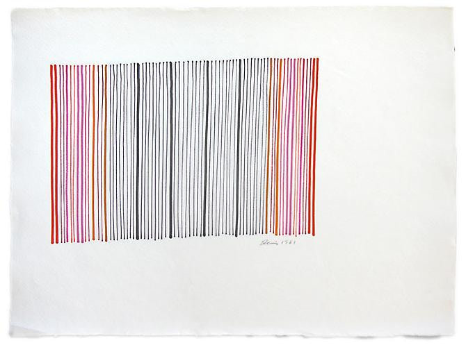 In 1958, in a conscious effort to bring new creative energy to his work by denying the conventions of Abstract Expressionism, Davis painted Peach Glow (estate of the artist), a small work of pale vertical edge-to-edge pink stripes. Drawing his inspiration from Barnett Newman’s “zips,” Jasper John’s flags and targets, and Paul Klee’s geometric patterns, Davis soon fixed on the stripe as his signature image and developed it with remarkable fervor and inventiveness. He began to vary radically the color of his stripes and to arrange stripes and clusters of stripes in complicated orchestrations of color and interval. One canvas might be dense with bands of edge¬-to-edge stripes while another might open up with passages of empty canvas; one might be constructed from wide bands, another from narrow pinstripes; one canvas might be characterized by dark moody colors, another by brilliant colors, even Dayglo paints. Almost all of the variants on stripe painting were developed over a short time. “During the period between 1958 and 1960,” Davis later said, “I staked out almost all the different types of stripe paintings. . . . Then, ten years later, I came back and picked up on loose threads.2
