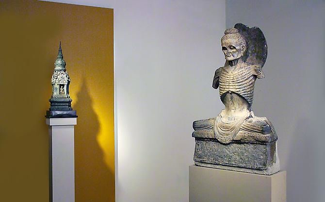 • A superbly carved 6th century torso of a male deity from the Mekong Delta.